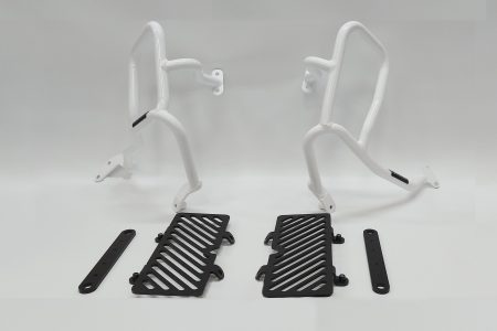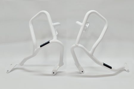 We've designed a set of bars for the front end of the 450 Rally. These will serve mostly as a luggage and accessories platform, so you can bring more with you on your travels and also to better distribute the weight between rear and front end of the bike. These are not Crash Bars, but will still offer some level of protection.*