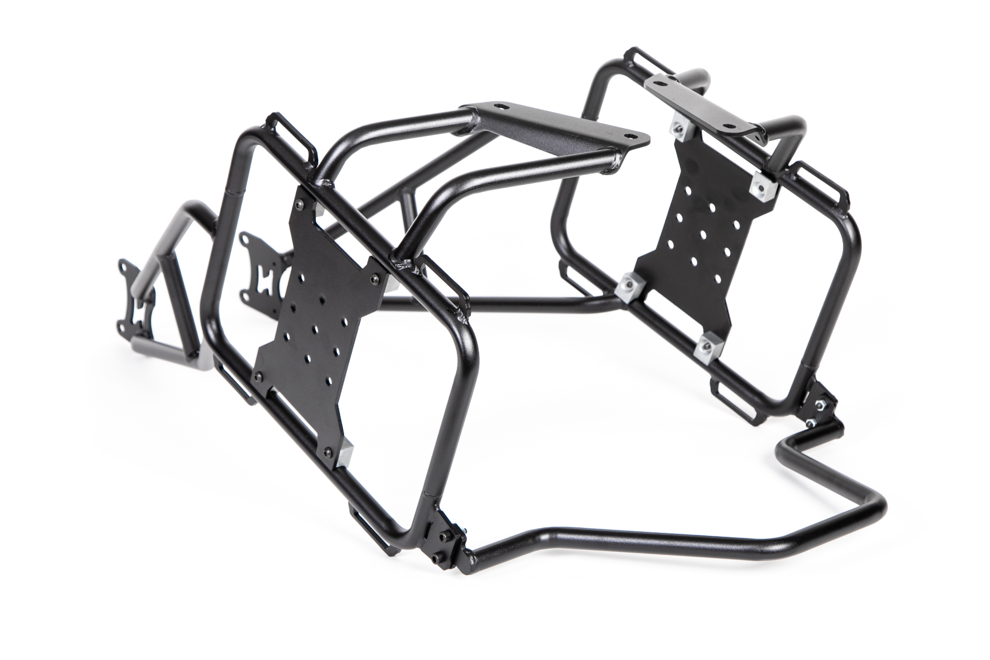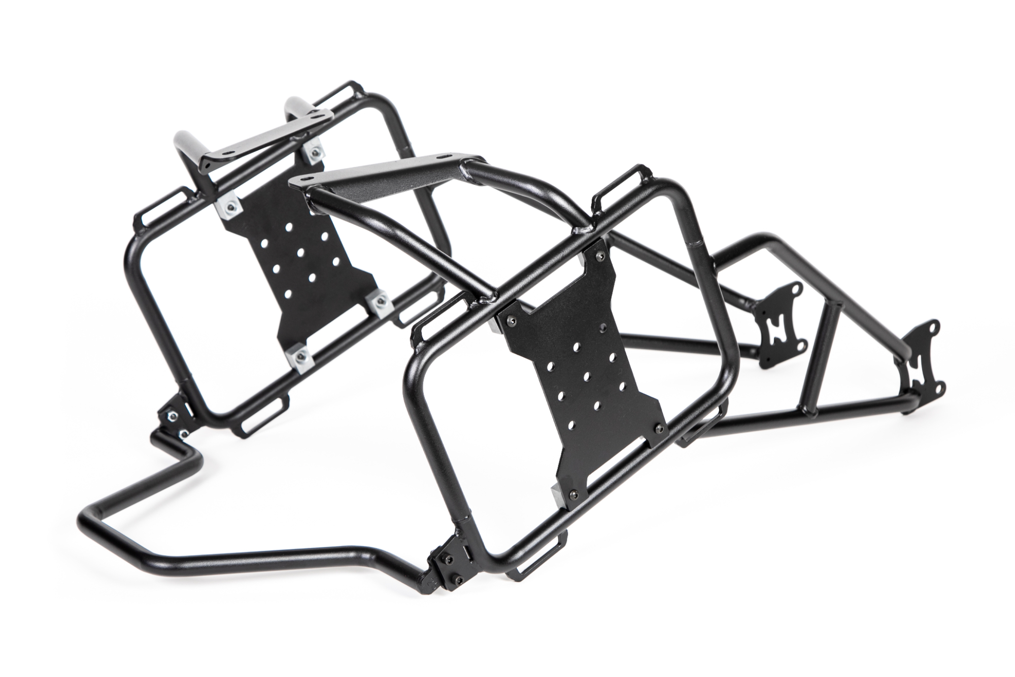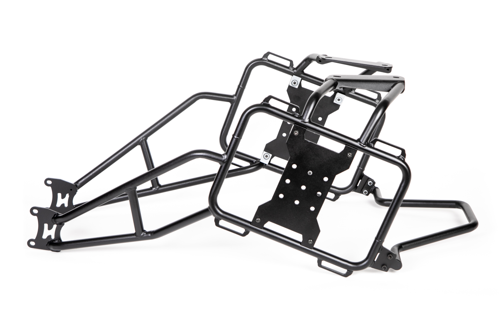 Progettato da Adventure Moto Australia e prodotto da Outback Motortek. Il nuovo telaio X-Frame è il supporto universale che permette un trasporto sicuro di borse laterali morbide, valigie laterali rigide e serbatoi supplementari Rotopax per acqua e benzina. Il telaio è verniciato a polvere e, oltre ad offrire vari punti di aggancio, include una piastra a forma di X, forata su più punti, che permette la disposizione uniforme del peso dei bagagli e l’installazione di accessori dedicati. È possibile rimuovere la piastra ad X per l’utilizzo di valigie rigide o per ridurre il peso complessivo del telaio.