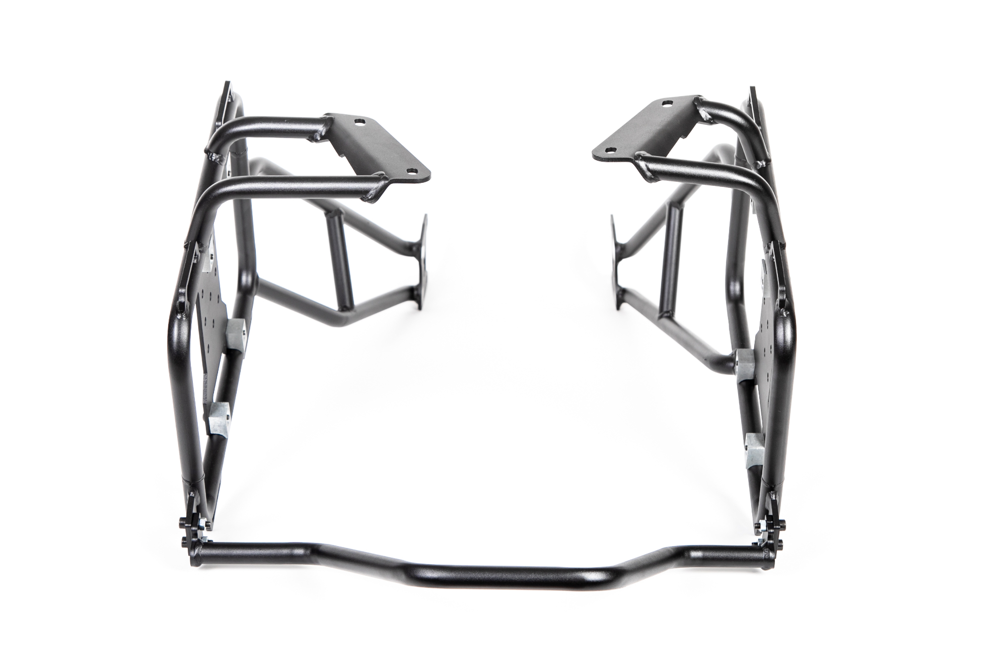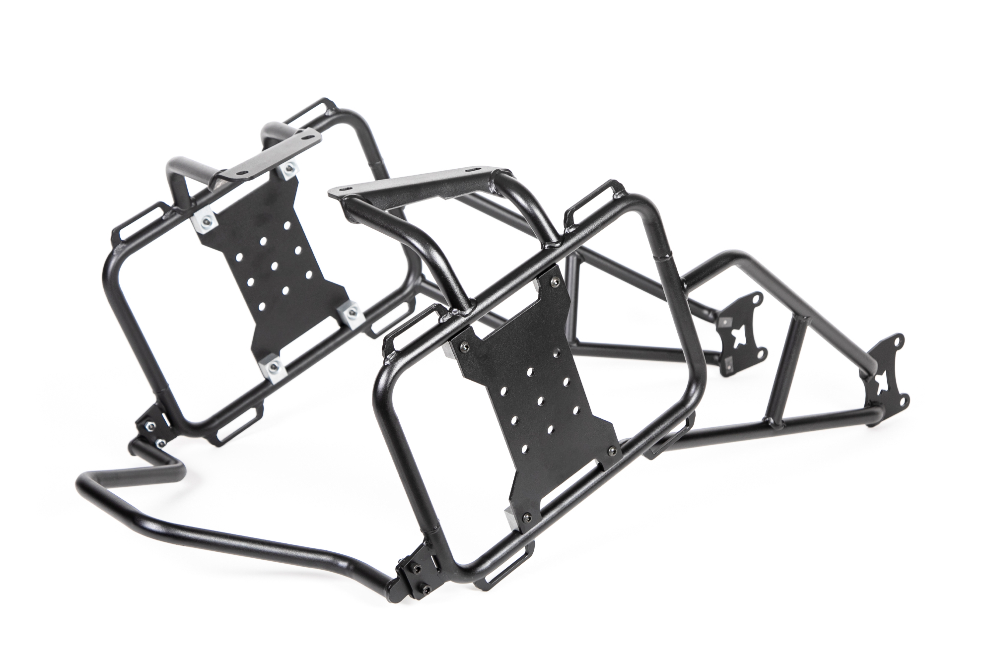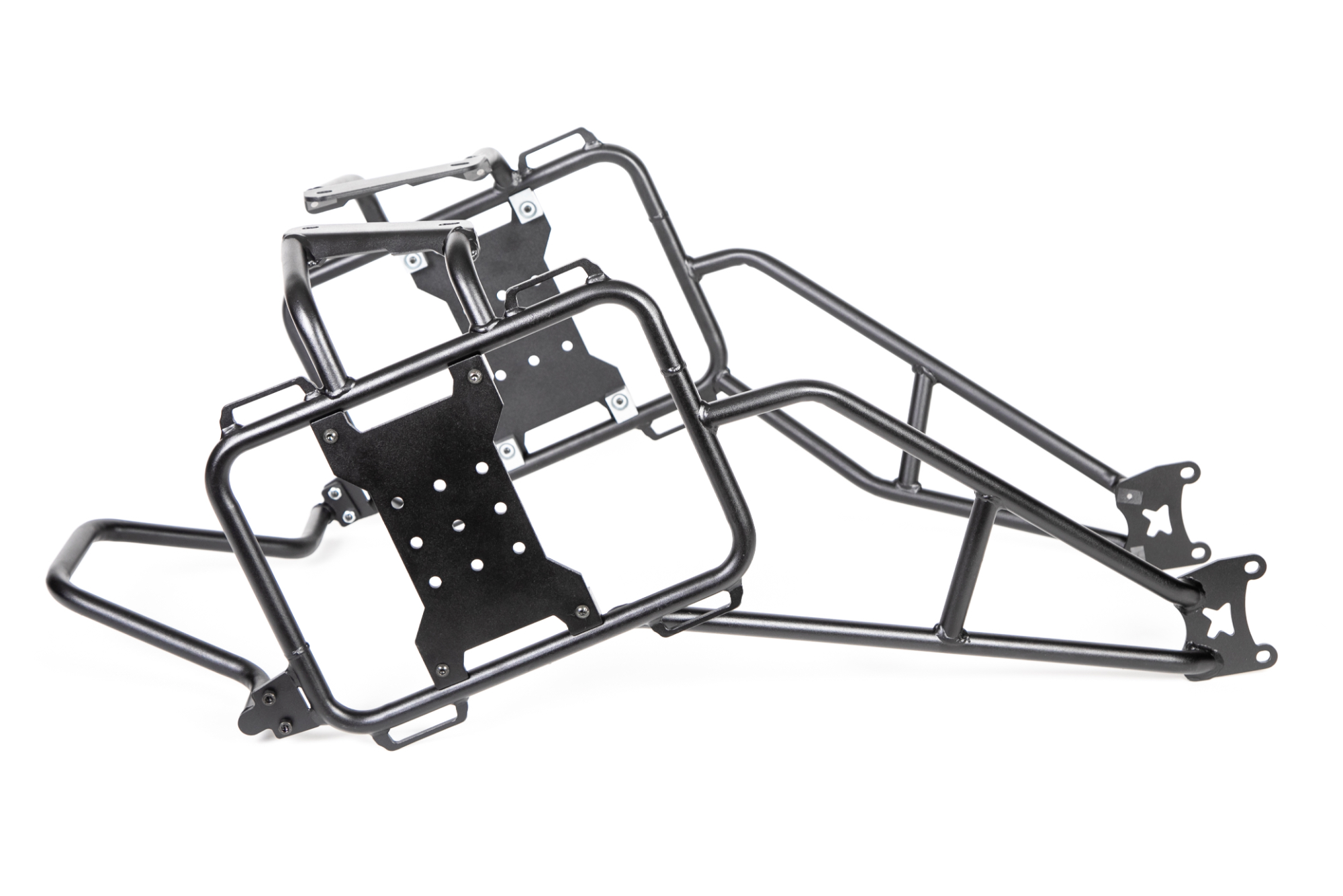 Progettato da Adventure Moto Australia e prodotto da Outback Motortek. Il nuovo telaio X-Frame è il supporto universale che permette un trasporto sicuro di borse laterali morbide, valigie laterali rigide e serbatoi supplementari Rotopax per acqua e benzina. Il telaio è verniciato a polvere e, oltre ad offrire vari punti di aggancio, include una piastra a forma di X, forata su più punti, che permette la disposizione uniforme del peso dei bagagli e l’installazione di accessori dedicati. È possibile rimuovere la piastra ad X per l’utilizzo di valigie rigide o per ridurre il peso complessivo del telaio.