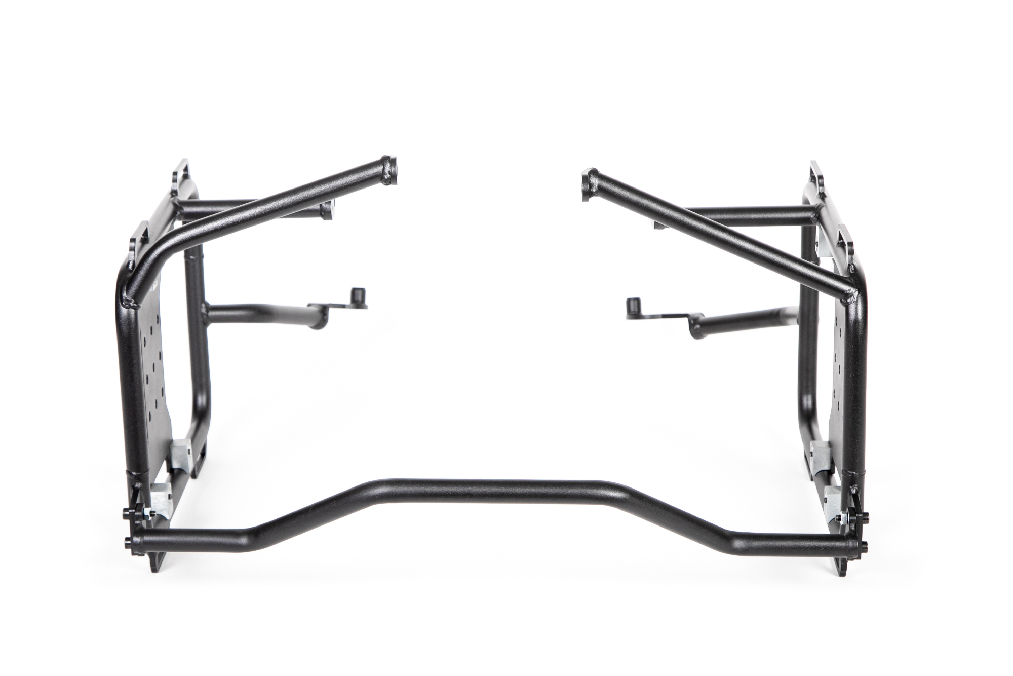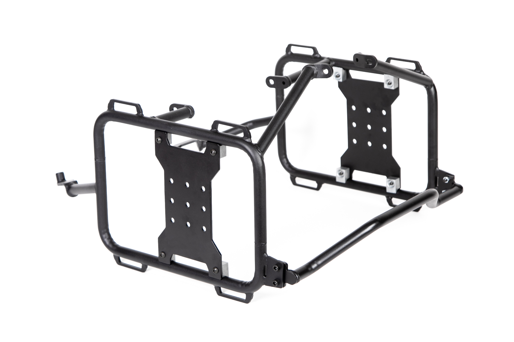Progettato da Adventure Moto Australia e prodotto da Outback Motortek. Il nuovo telaio X-Frame è il supporto universale che permette un trasporto sicuro di borse laterali morbide, valigie laterali rigide e serbatoi supplementari Rotopax per acqua e benzina. Il telaio è verniciato a polvere e, oltre ad offrire vari punti di aggancio, include una piastra a forma di X, forata su più punti, che permette la disposizione uniforme del peso dei bagagli e l’installazione di accessori dedicati. È possibile rimuovere la piastra ad X per l’utilizzo di valigie rigide o per ridurre il peso complessivo del telaio.